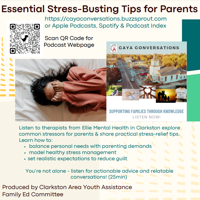 Join us with our friends at CAYA. We will dive deep into the challenges and triumphs of parenting. We will also explore student life in the Clarkston area. Our expert therapists bring their insights to the table, discussing vital topics that resonate with families today. From stress and time management to navigating co-parenting and blended families, we cover it all.