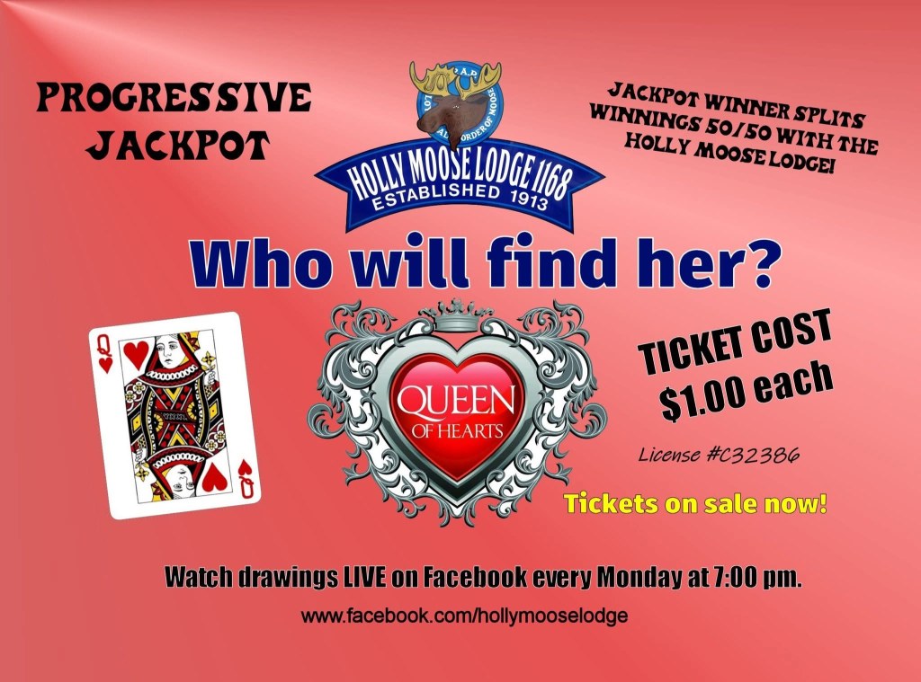 I also want to encourage you to visit the Holly Moose Lodge tonight anytime between 6 & 7 p.m., as HAYA’s very own Sydney Sinclair will be selling 50/50 raffle tickets. The Moose is graciously choosing HAYA as the beneficiary of tonight’s 50/50 proceeds. You could also take part in the Moose’s Queen of Hearts lottery drawing. Please consider attending the Moose 50/50 raffle tonight from 6 & 7 p.m. Tickets for both drawings are sold from 6 – 7 p.m. with the drawing taking place at 7 p.m.